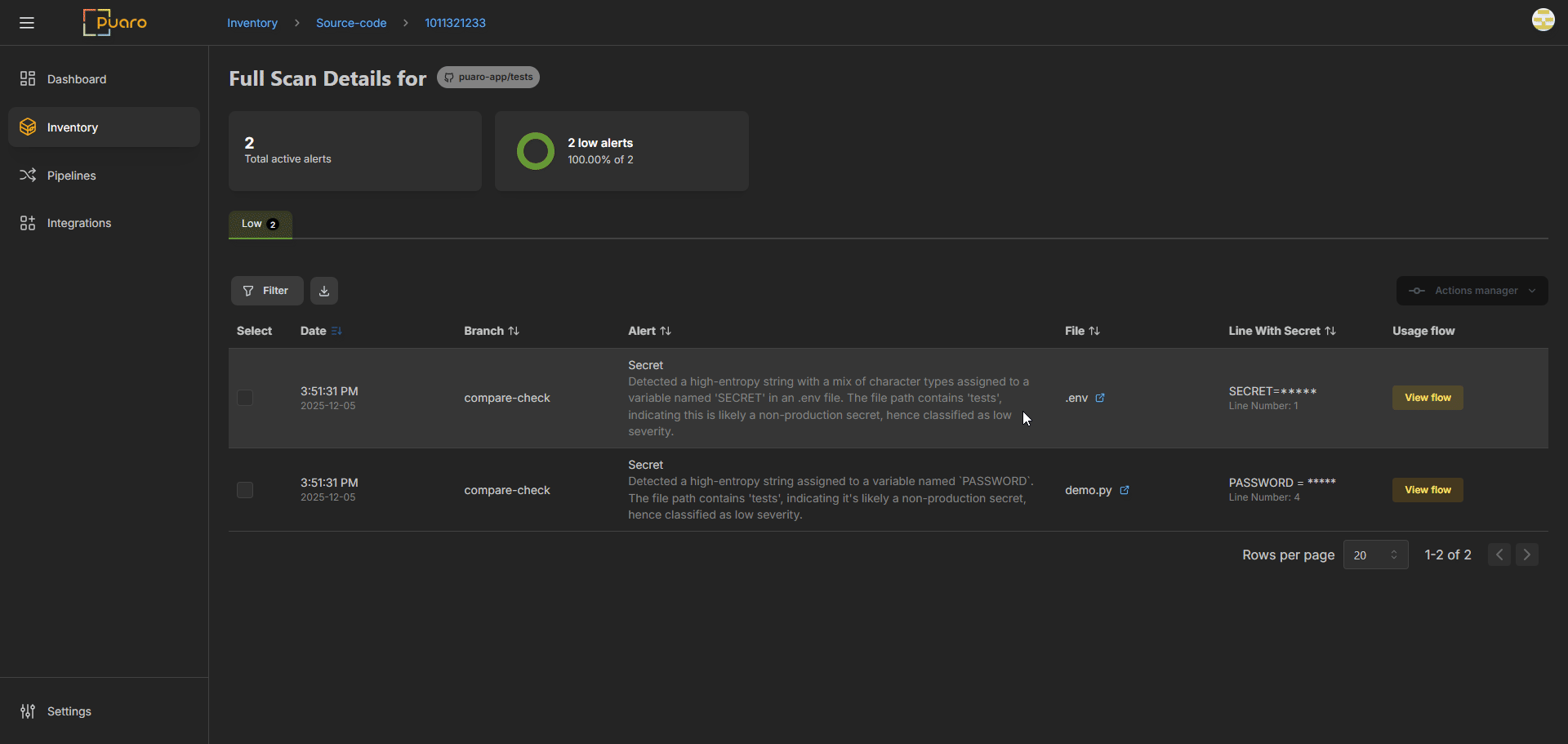 See real findings in context: repository inventory, severity, and usage flow — the same view your team uses to triage secrets.